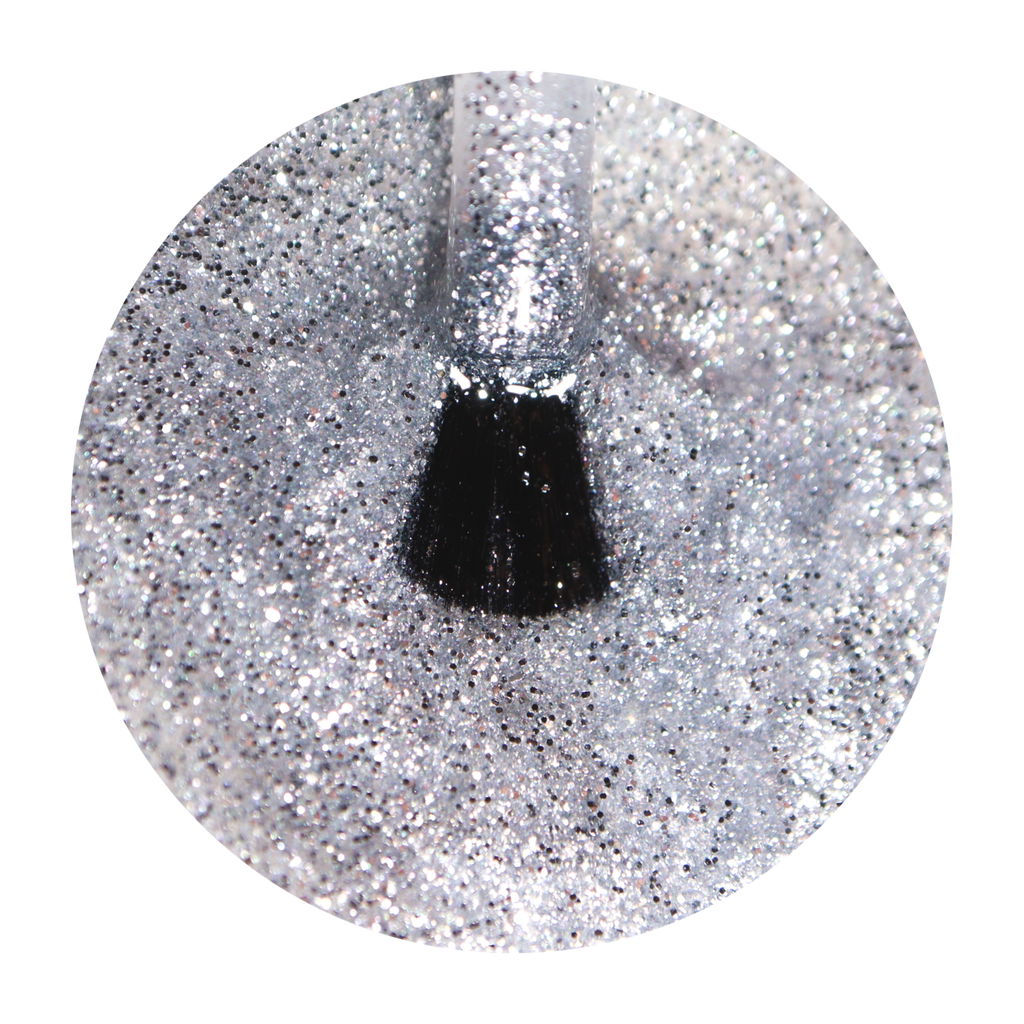 Superfint Silver glitter gellack från julkalendern 2025! Innehåller 12 g härda 1 min i led eller 2 min i uv.